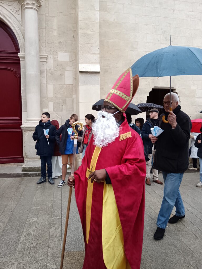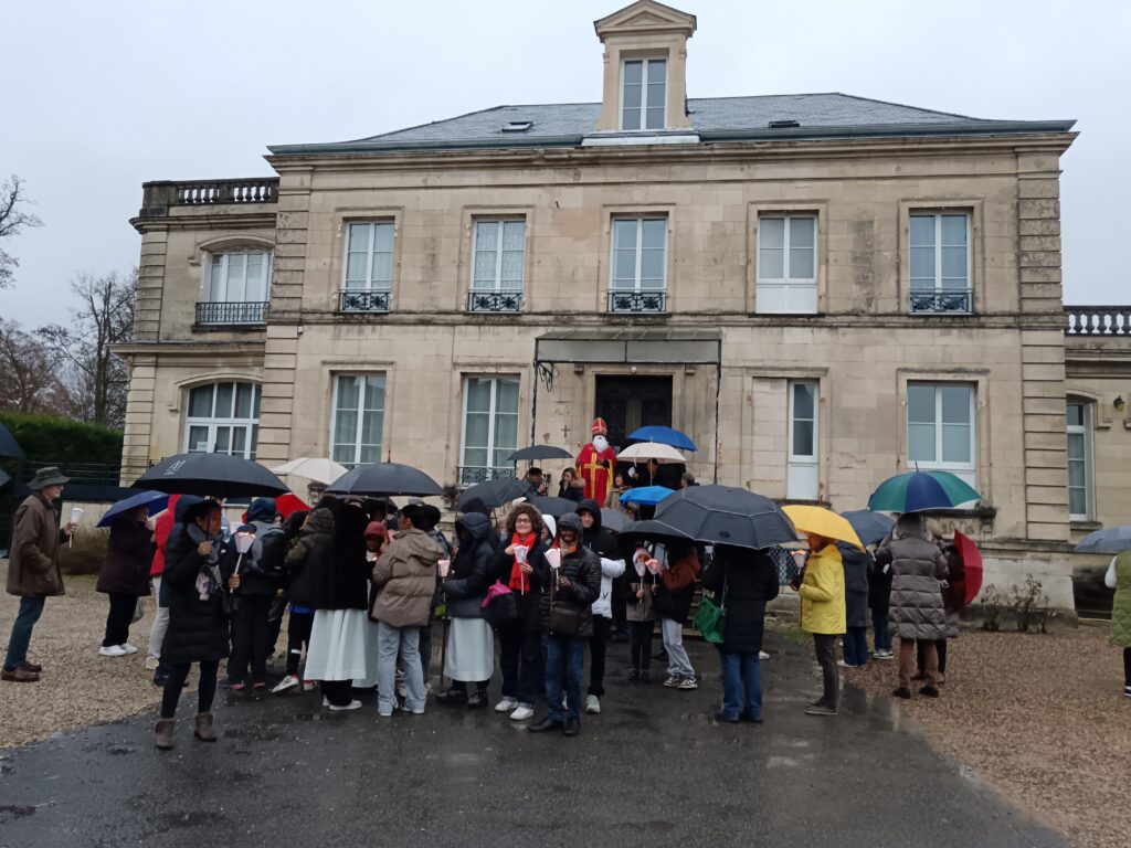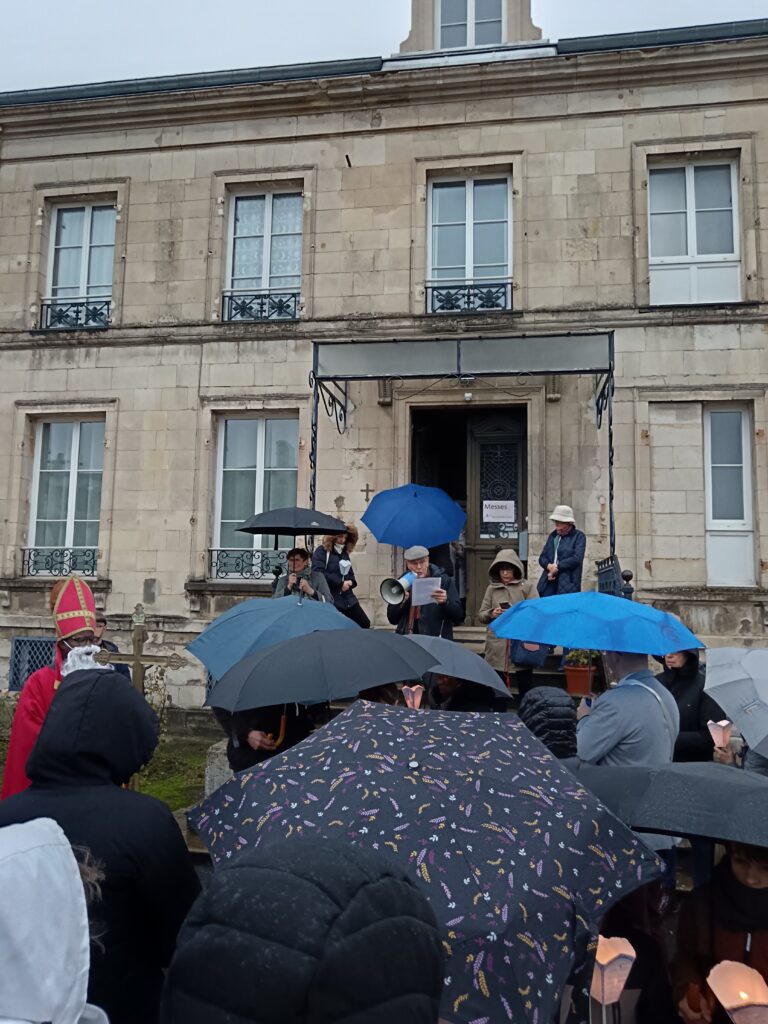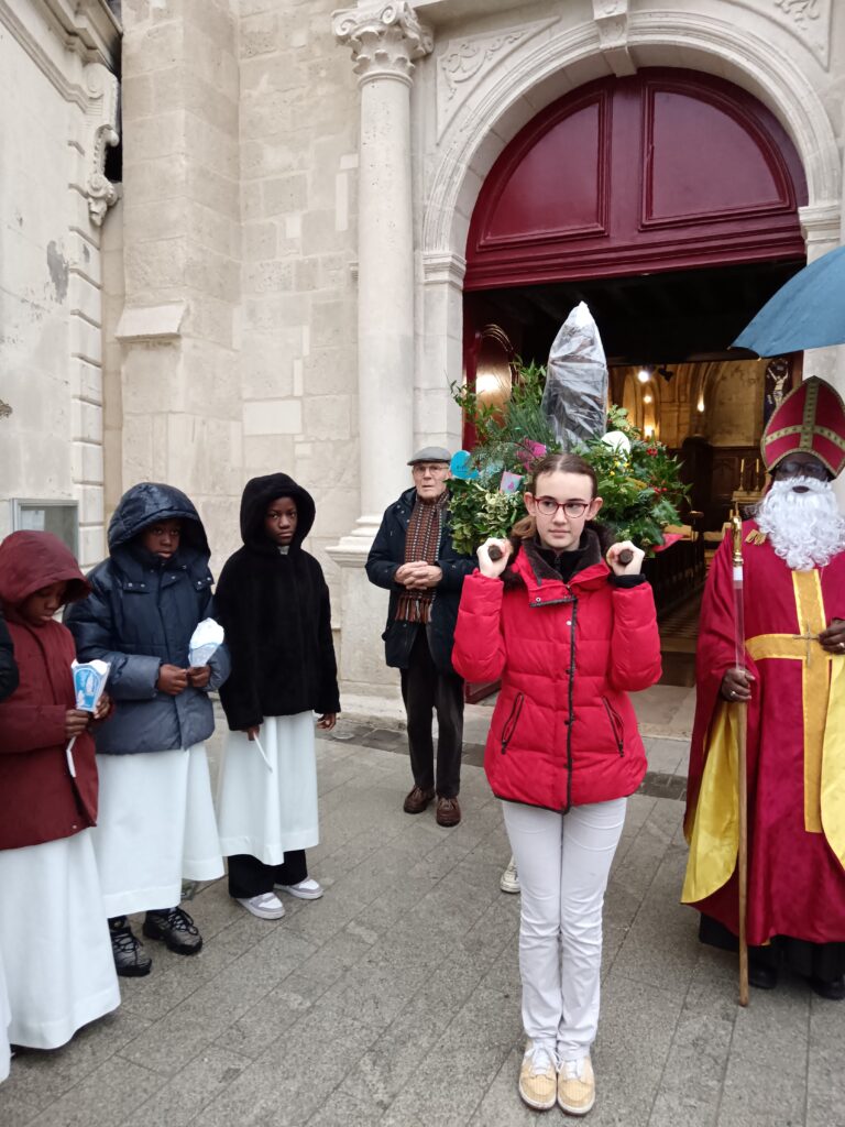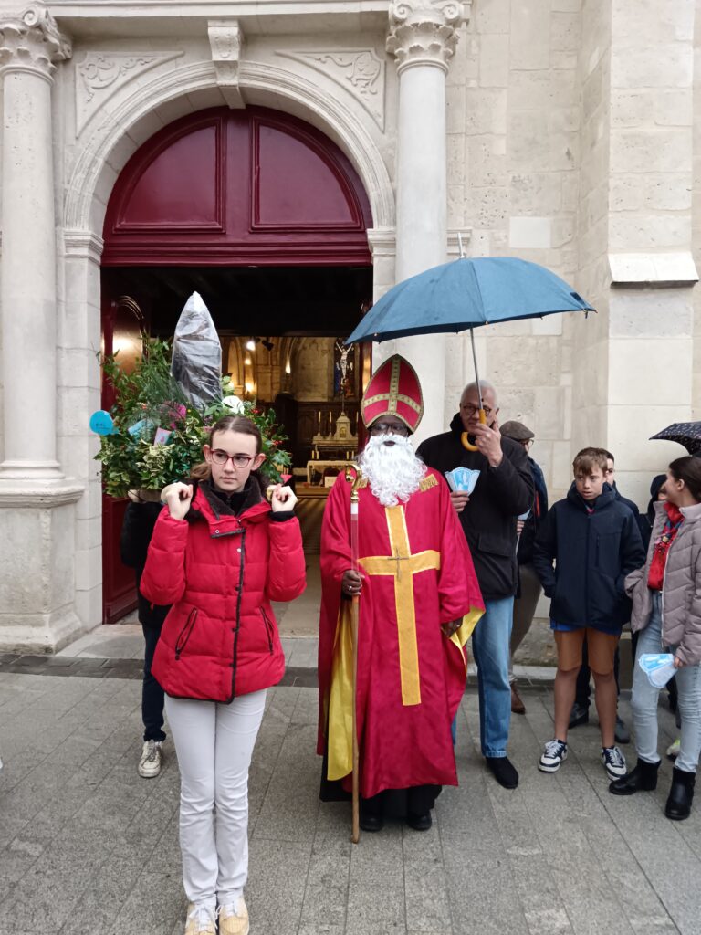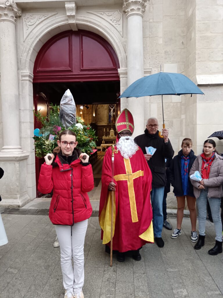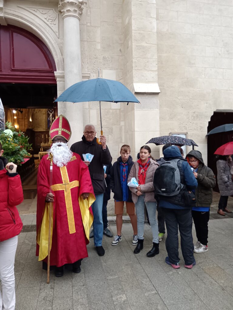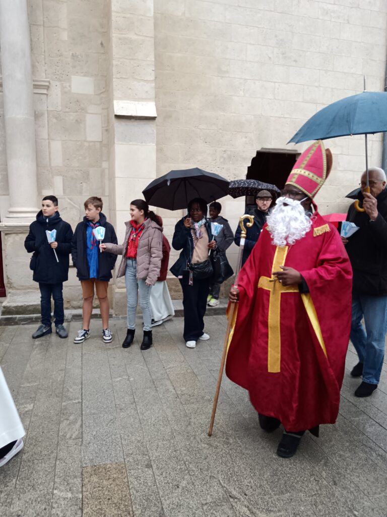 9 h 00 – Rendez-vous à la maison paroissiale Malgré un ciel bien gris et une pluie fine, la joie était déjà au rendez-vous ! Petits et grands se sont retrouvés autour de la statue de saint Nicolas, fièrement portée par nos chers scouts. Avant de partir en procession, le Père Bernard nous a fait prier saint Nicolas et a confié à Dieu tous nos paroissiens, particulièrement les malades et les personnes isolées.