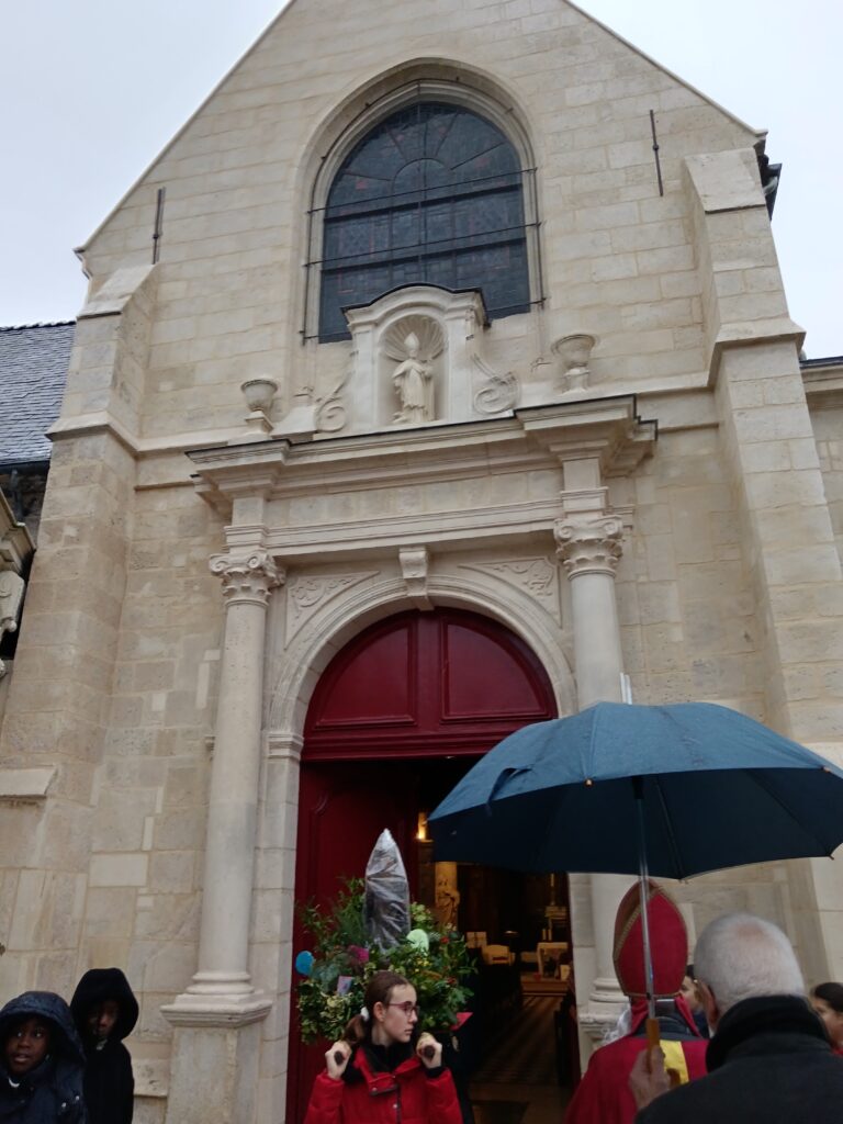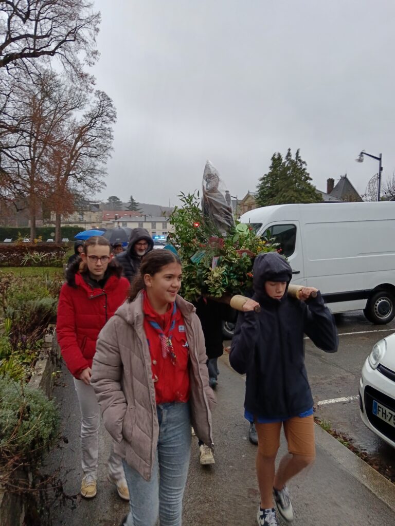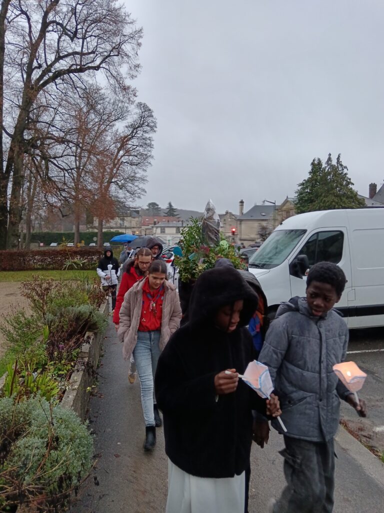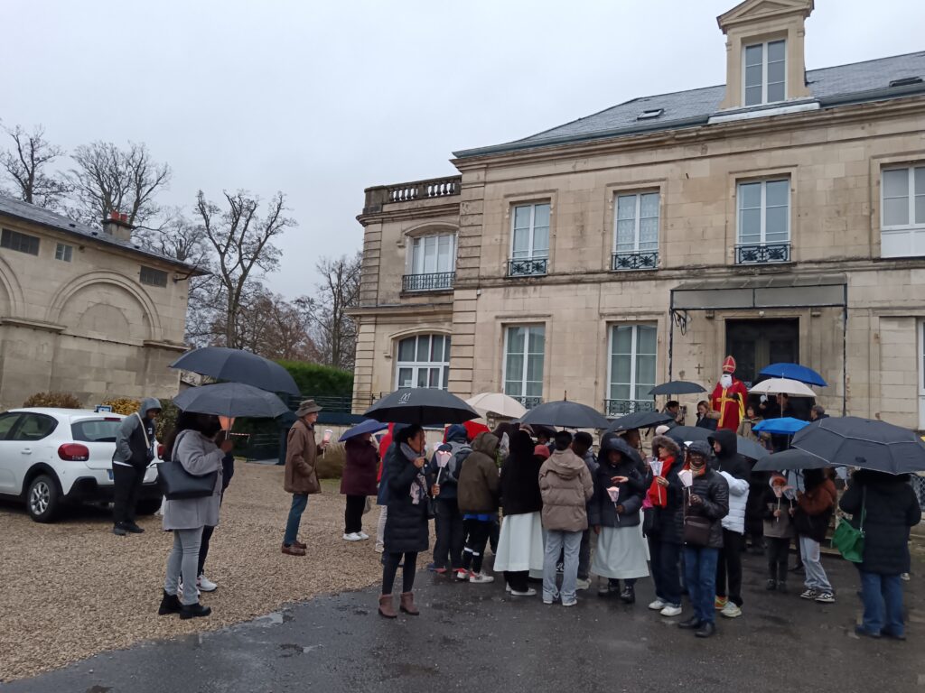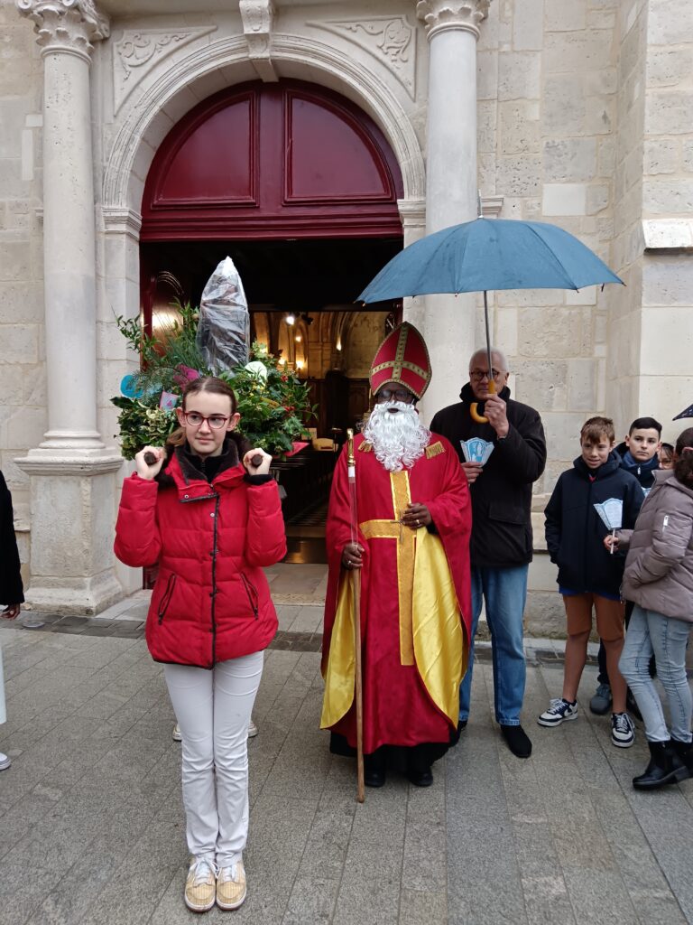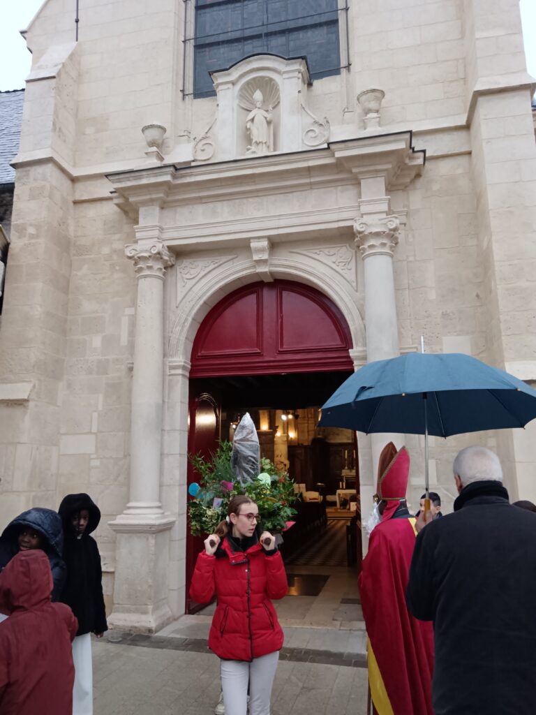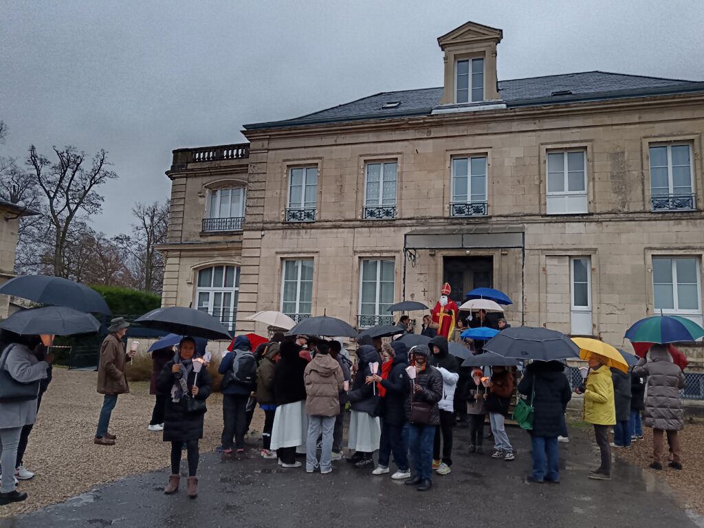9 h 00 – Rendez-vous à la maison paroissiale Malgré un ciel bien gris et une pluie fine, la joie était déjà au rendez-vous ! Petits et grands se sont retrouvés autour de la statue de saint Nicolas, fièrement portée par nos chers scouts. Avant de partir en procession, le Père Bernard nous a fait prier saint Nicolas et a confié à Dieu tous nos paroissiens, particulièrement les malades et les personnes isolées.