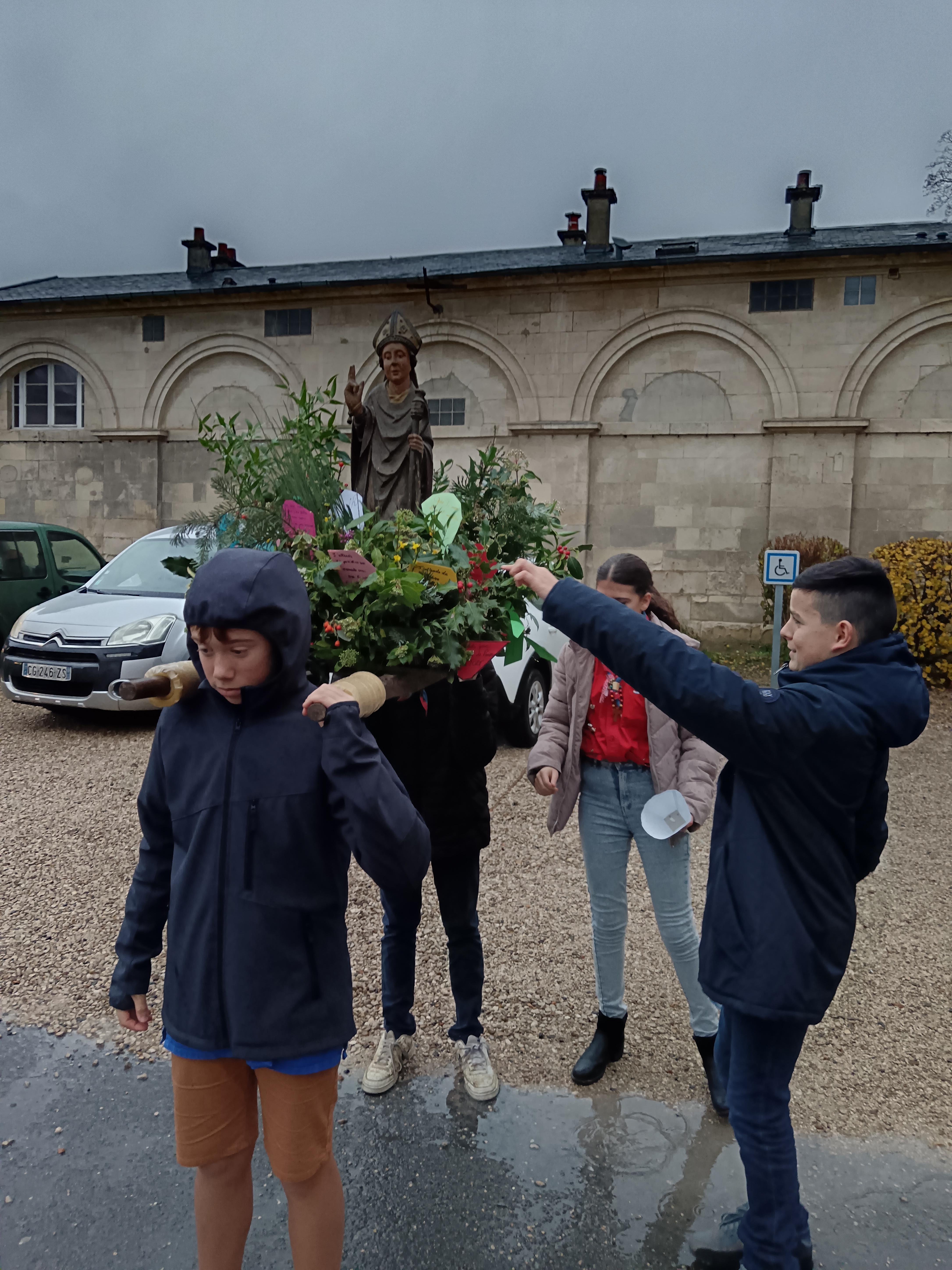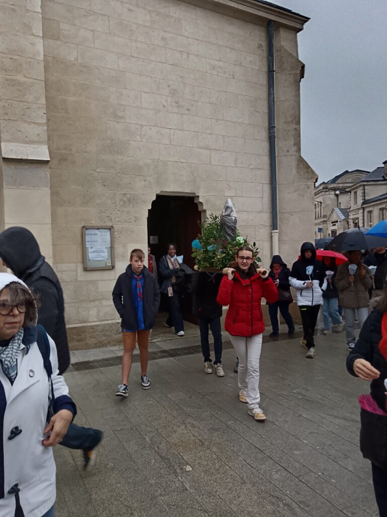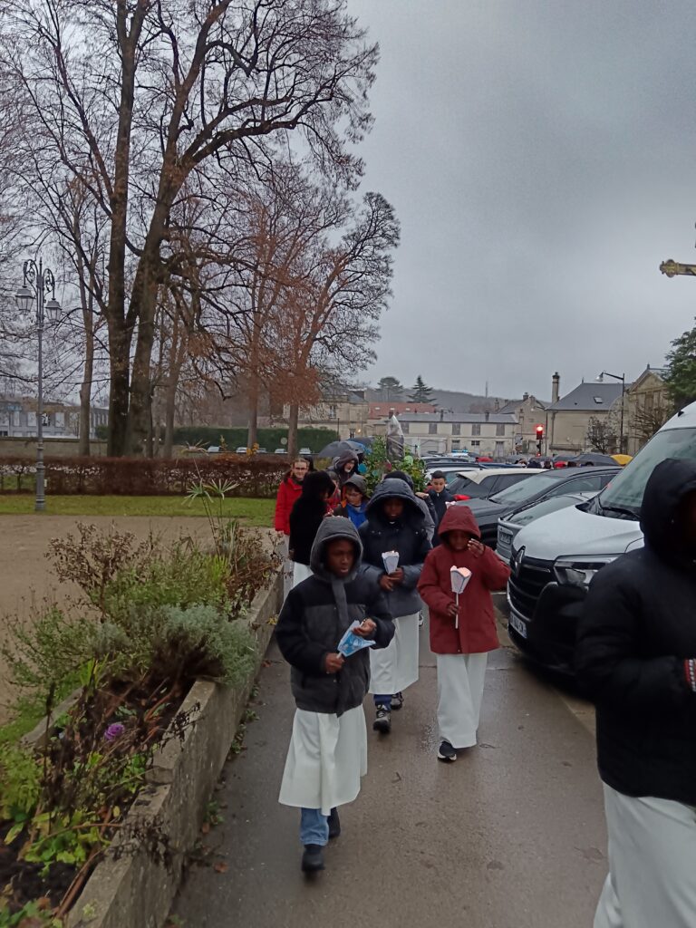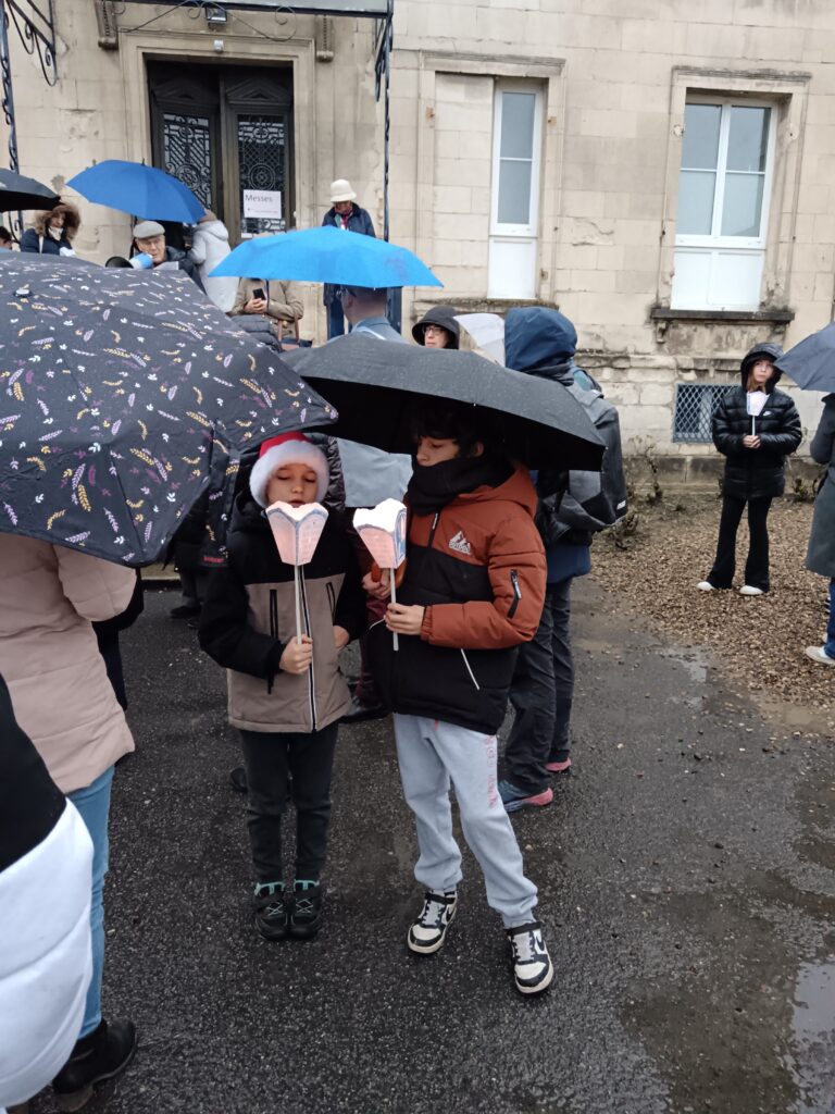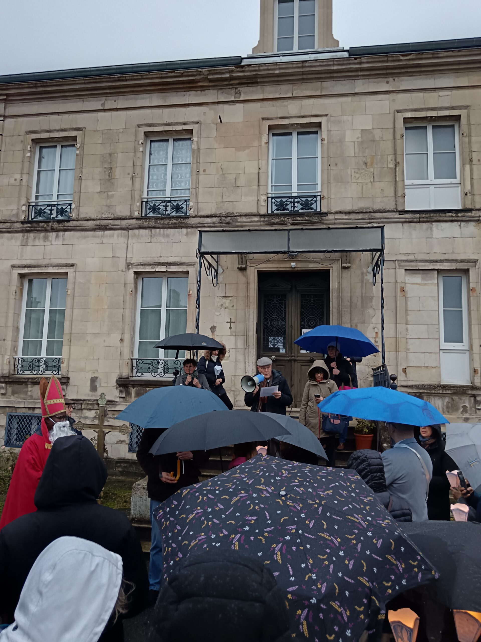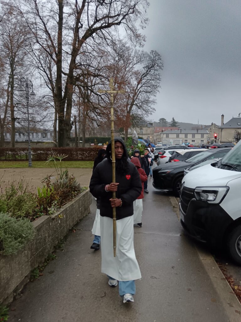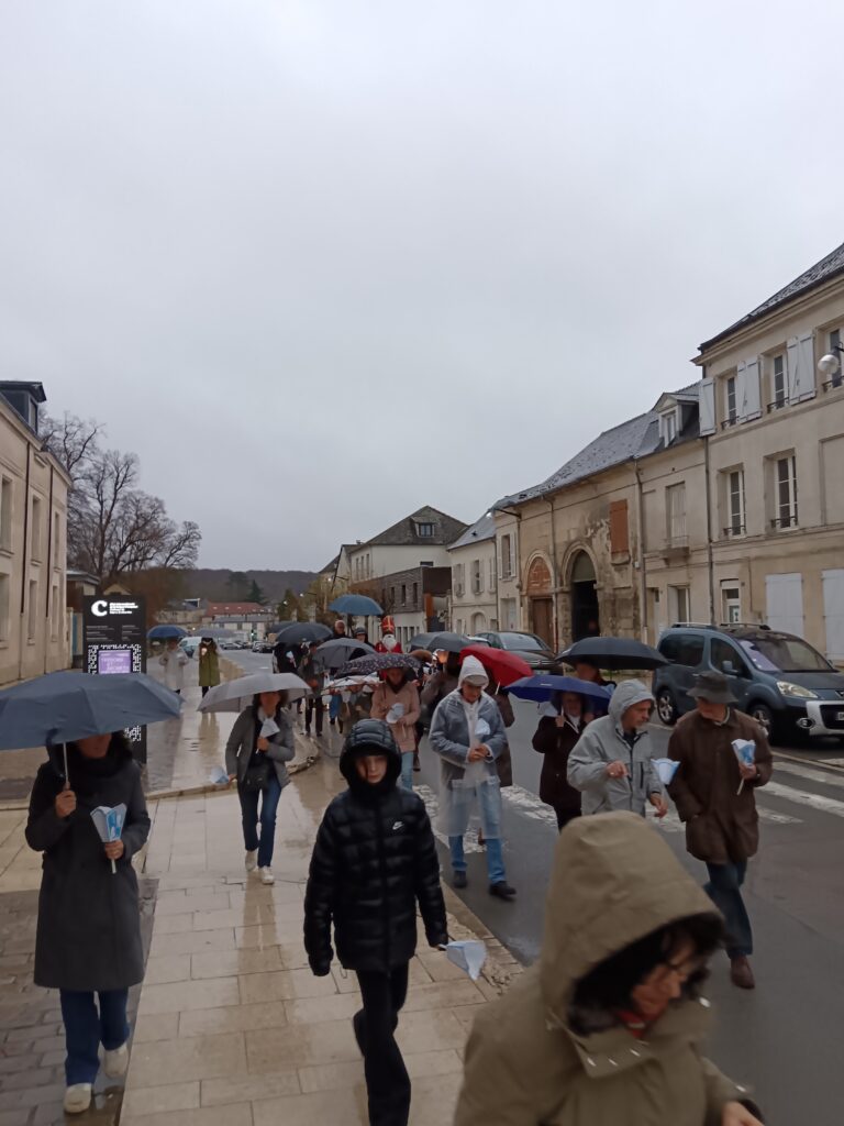 9 h 00 – Rendez-vous à la maison paroissiale Malgré un ciel bien gris et une pluie fine, la joie était déjà au rendez-vous ! Petits et grands se sont retrouvés autour de la statue de saint Nicolas, fièrement portée par nos chers scouts. Avant de partir en procession, le Père Bernard nous a fait prier saint Nicolas et a confié à Dieu tous nos paroissiens, particulièrement les malades et les personnes isolées.