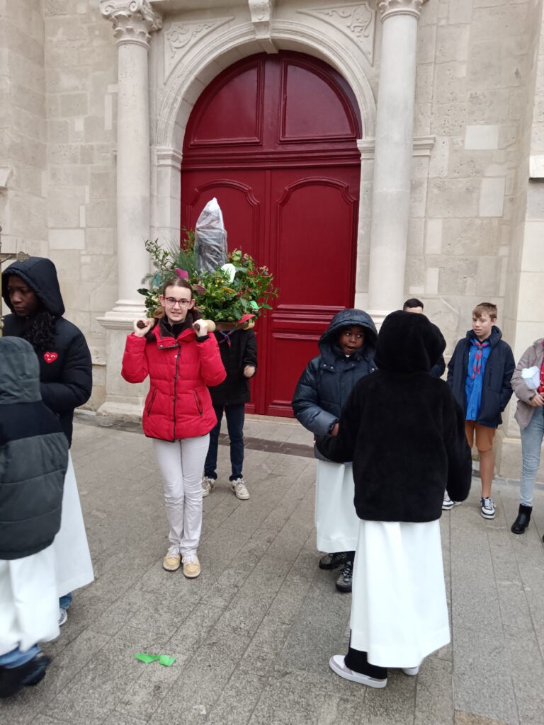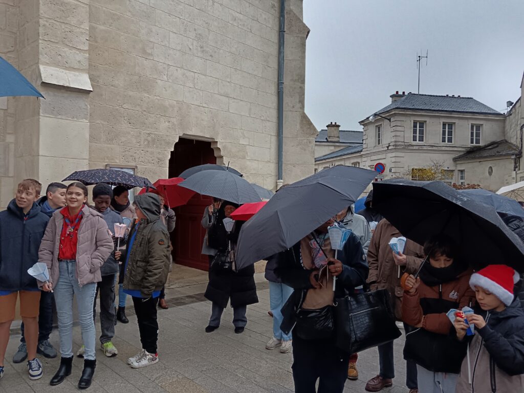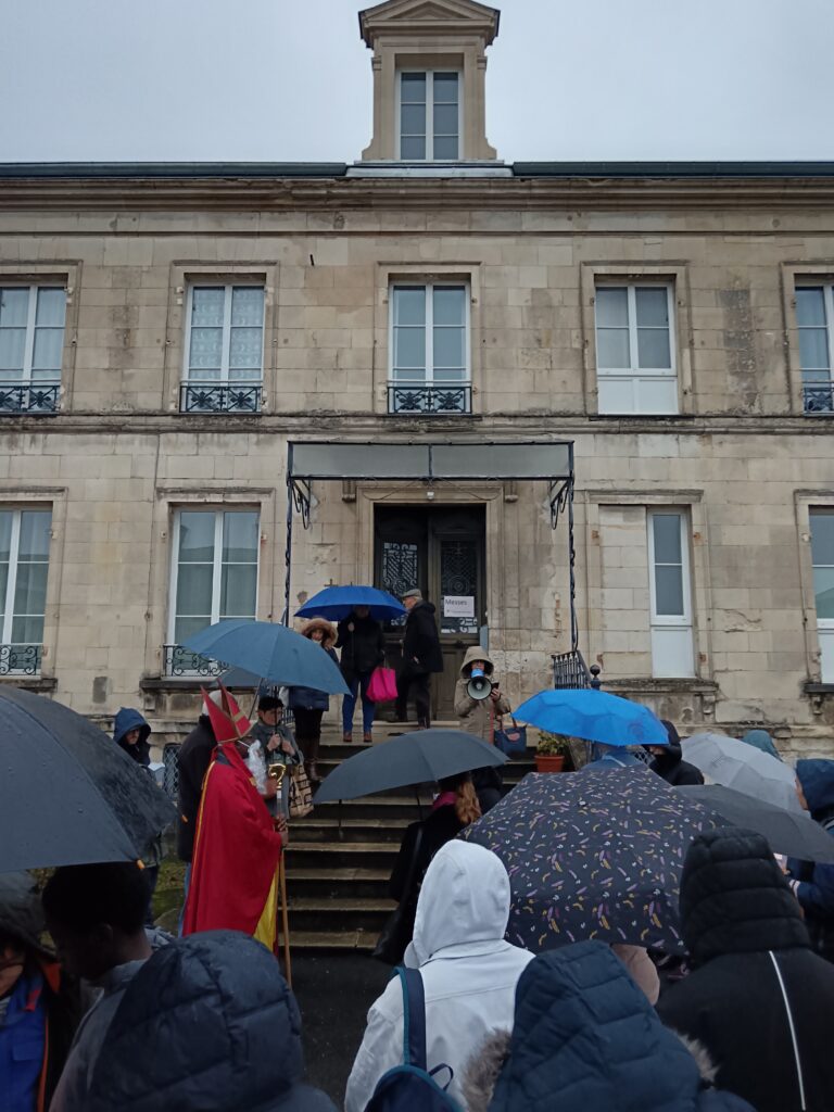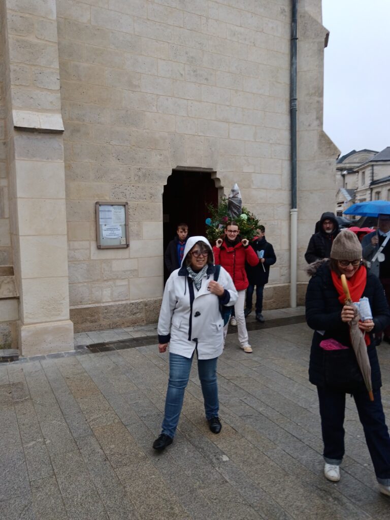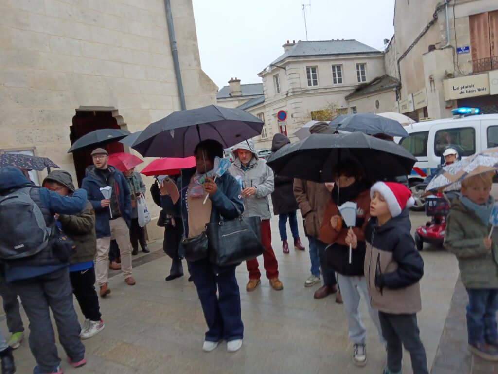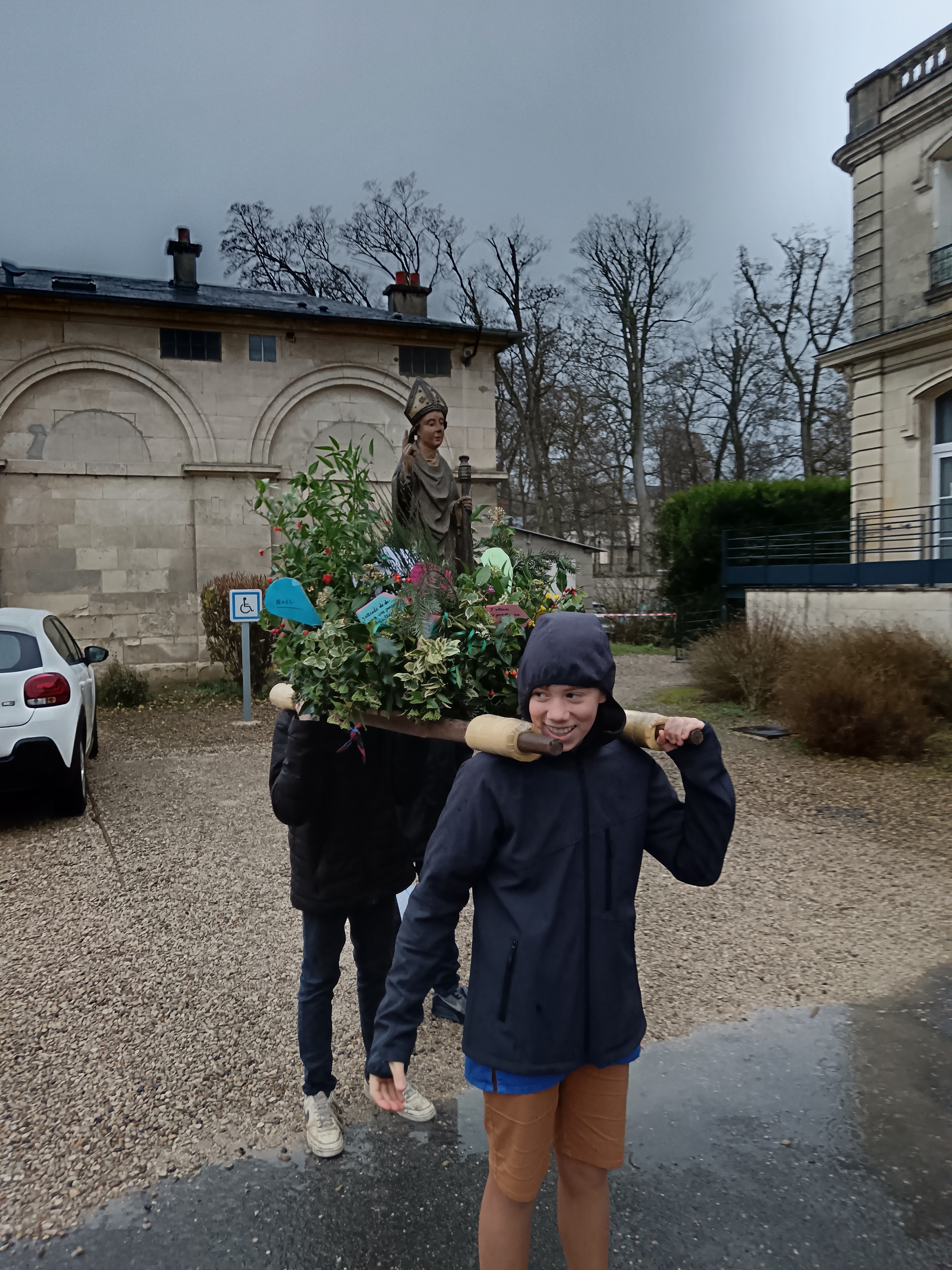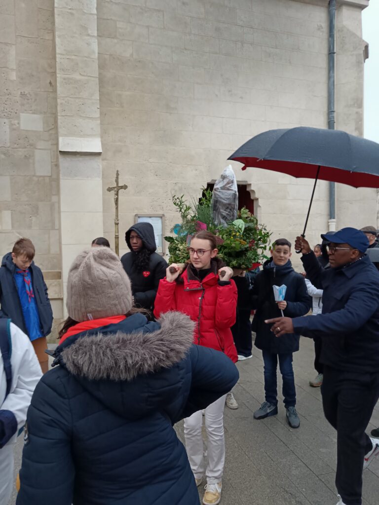 9 h 00 – Rendez-vous à la maison paroissiale Malgré un ciel bien gris et une pluie fine, la joie était déjà au rendez-vous ! Petits et grands se sont retrouvés autour de la statue de saint Nicolas, fièrement portée par nos chers scouts. Avant de partir en procession, le Père Bernard nous a fait prier saint Nicolas et a confié à Dieu tous nos paroissiens, particulièrement les malades et les personnes isolées.