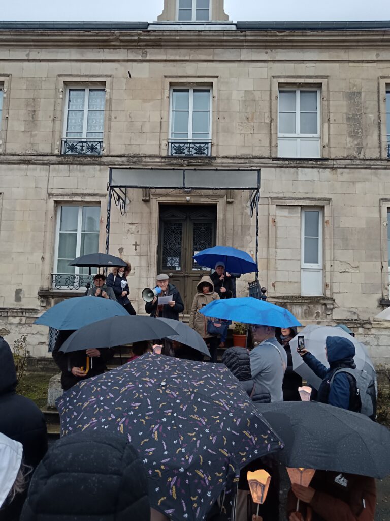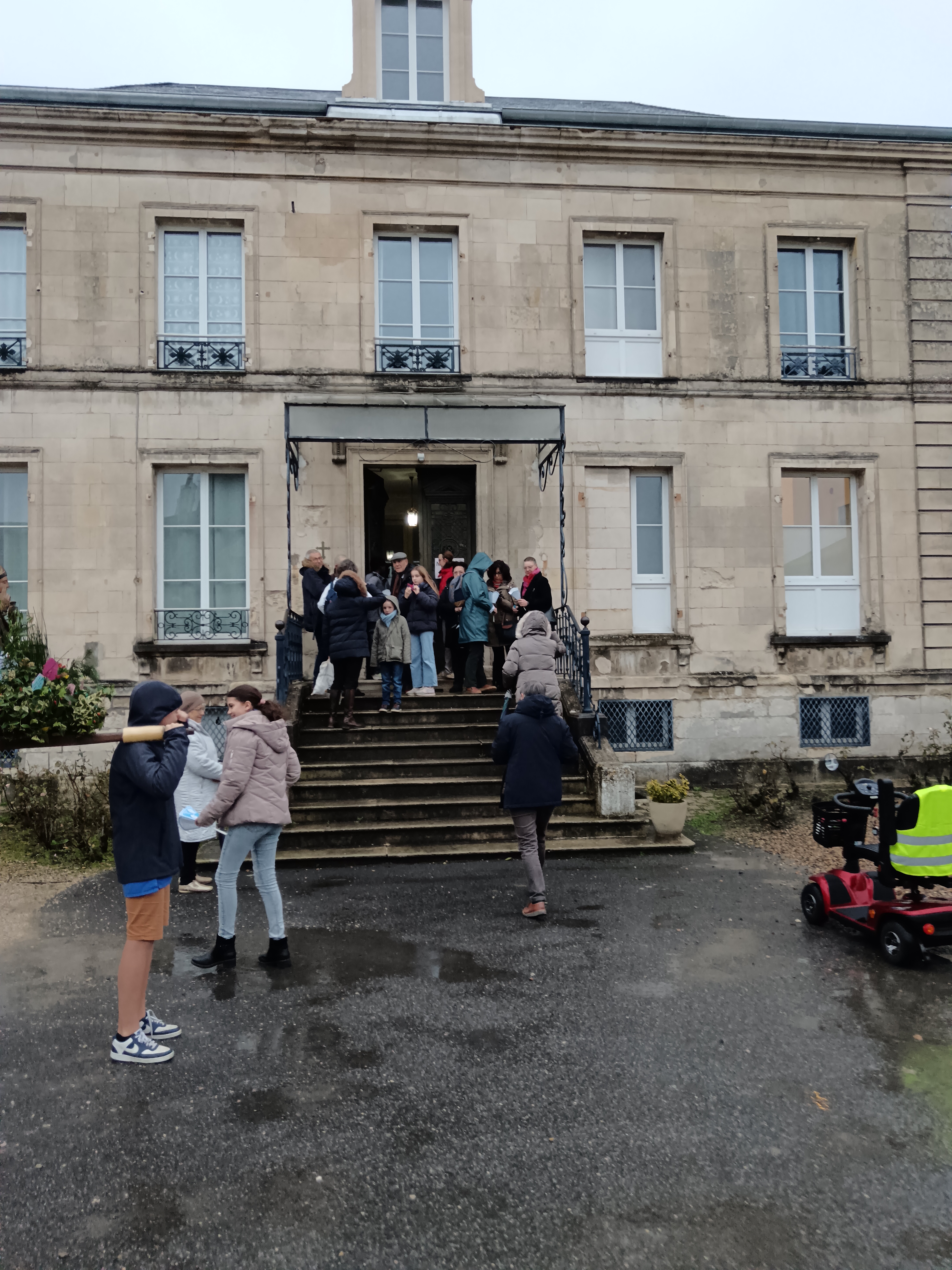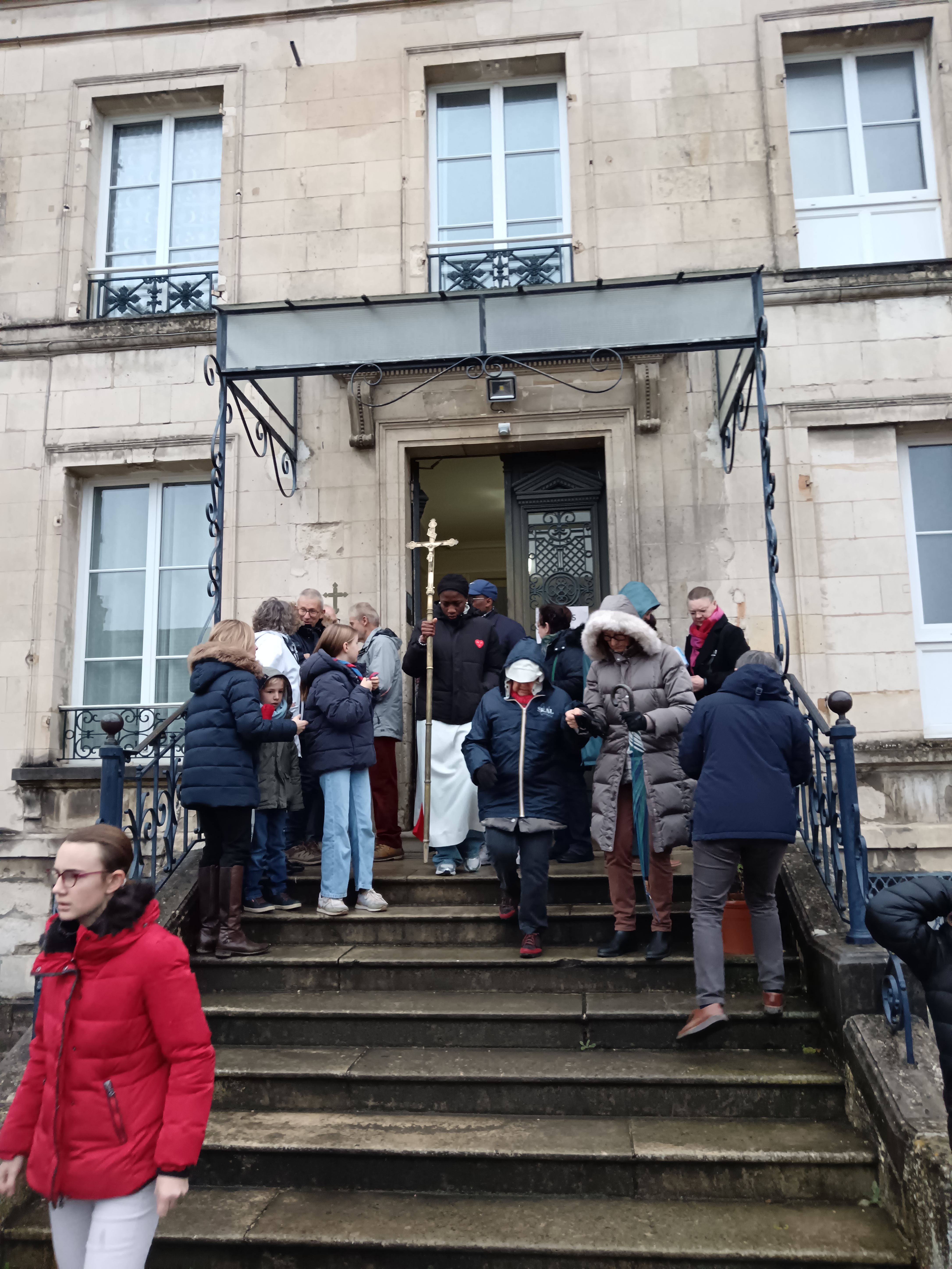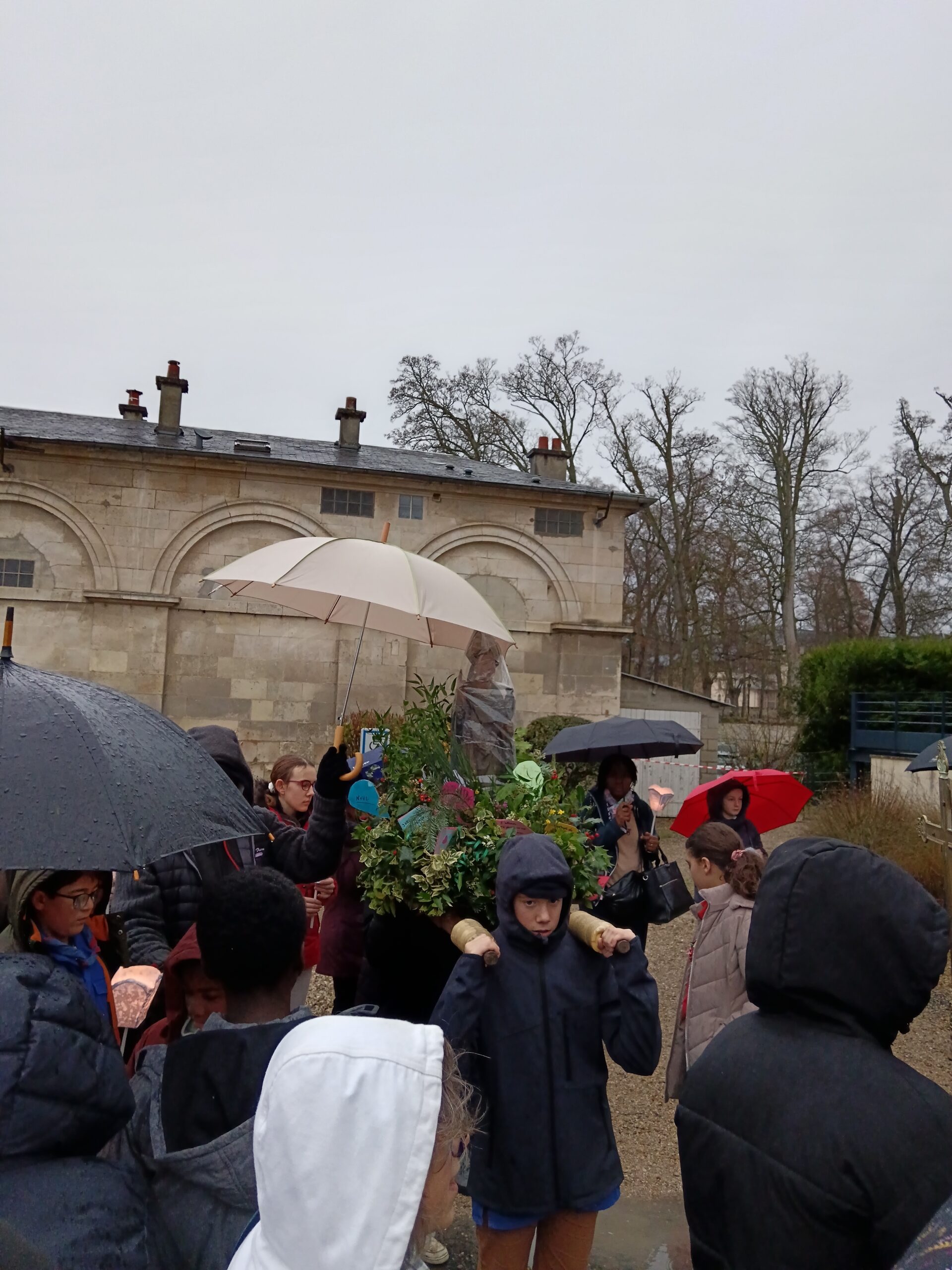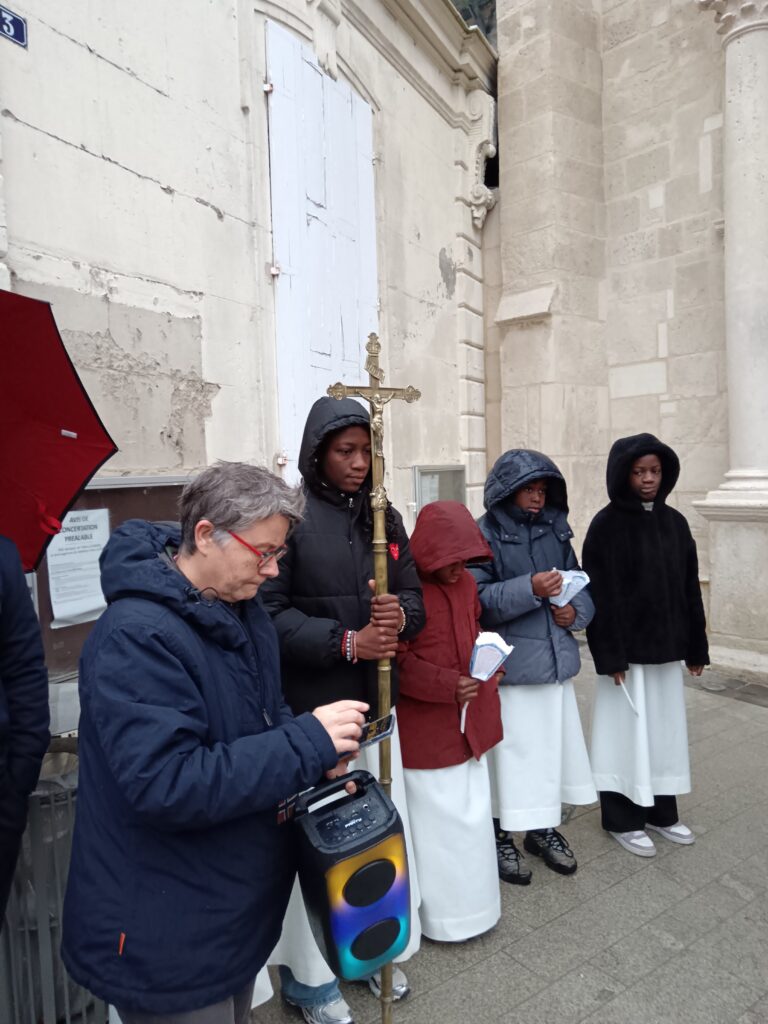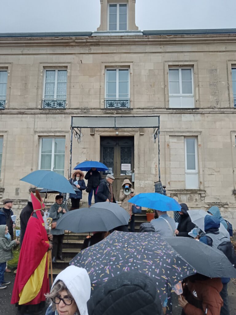 9 h 00 – Rendez-vous à la maison paroissiale Malgré un ciel bien gris et une pluie fine, la joie était déjà au rendez-vous ! Petits et grands se sont retrouvés autour de la statue de saint Nicolas, fièrement portée par nos chers scouts. Avant de partir en procession, le Père Bernard nous a fait prier saint Nicolas et a confié à Dieu tous nos paroissiens, particulièrement les malades et les personnes isolées.