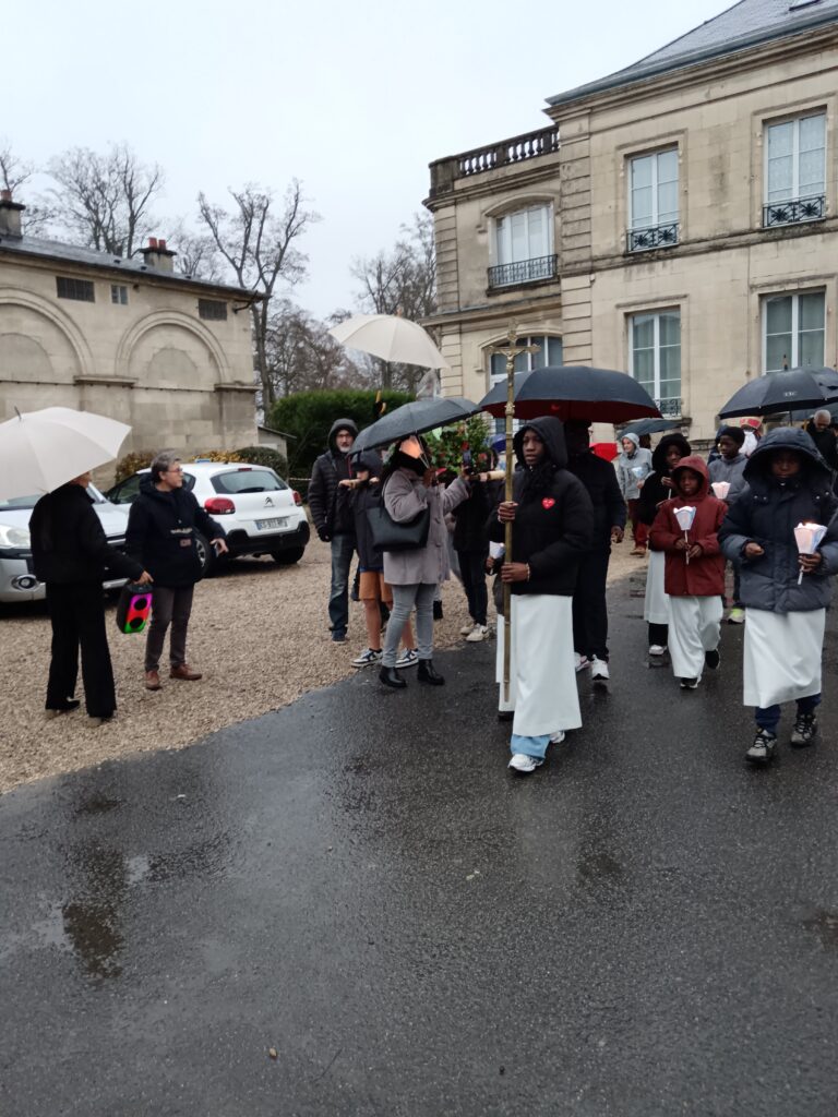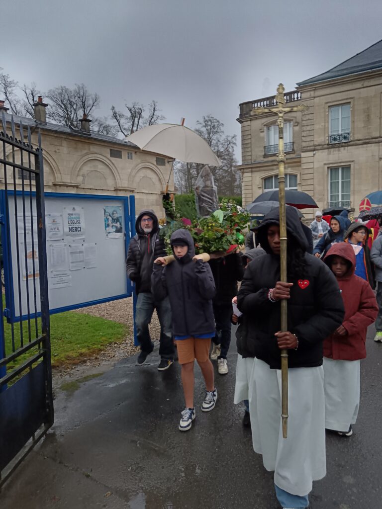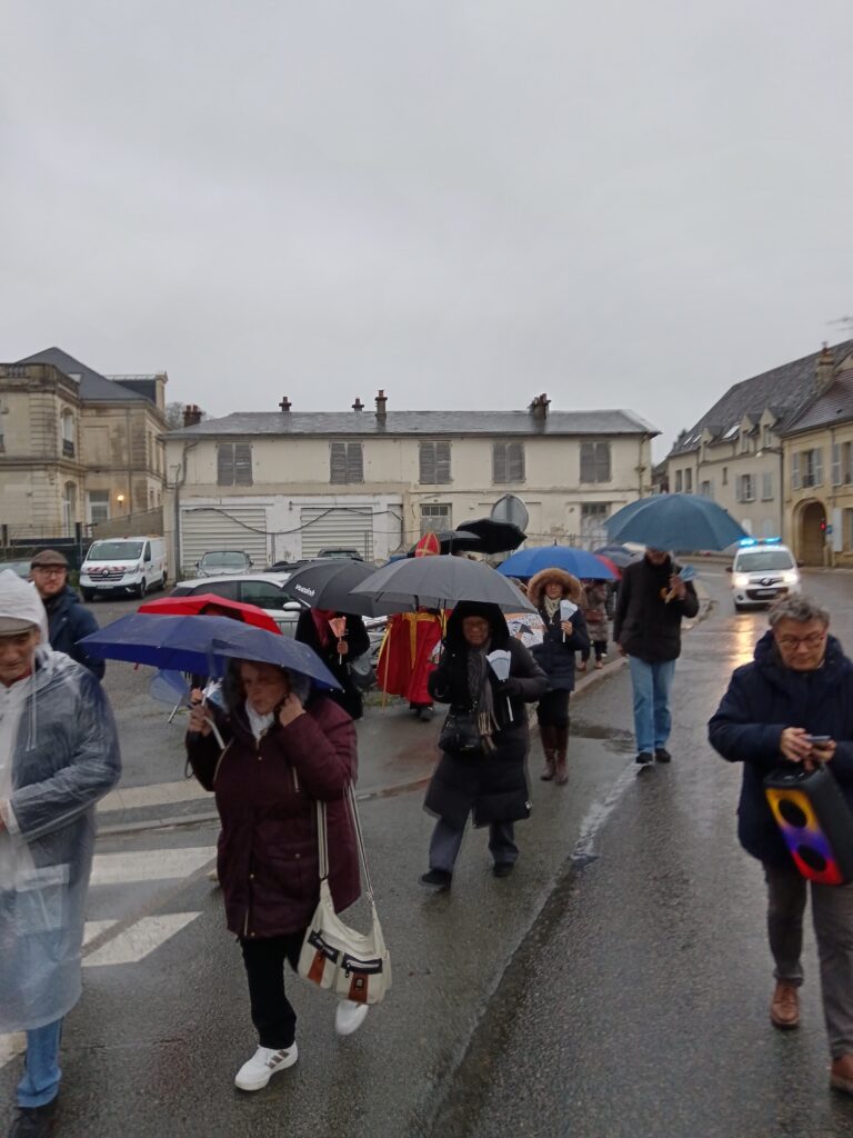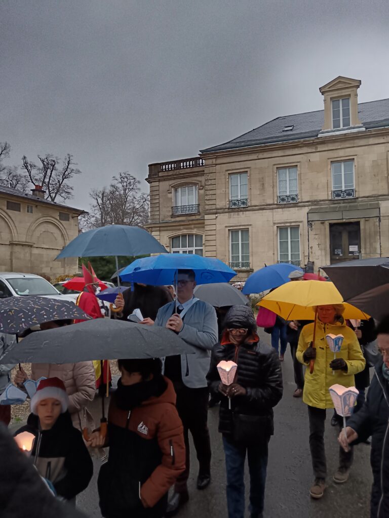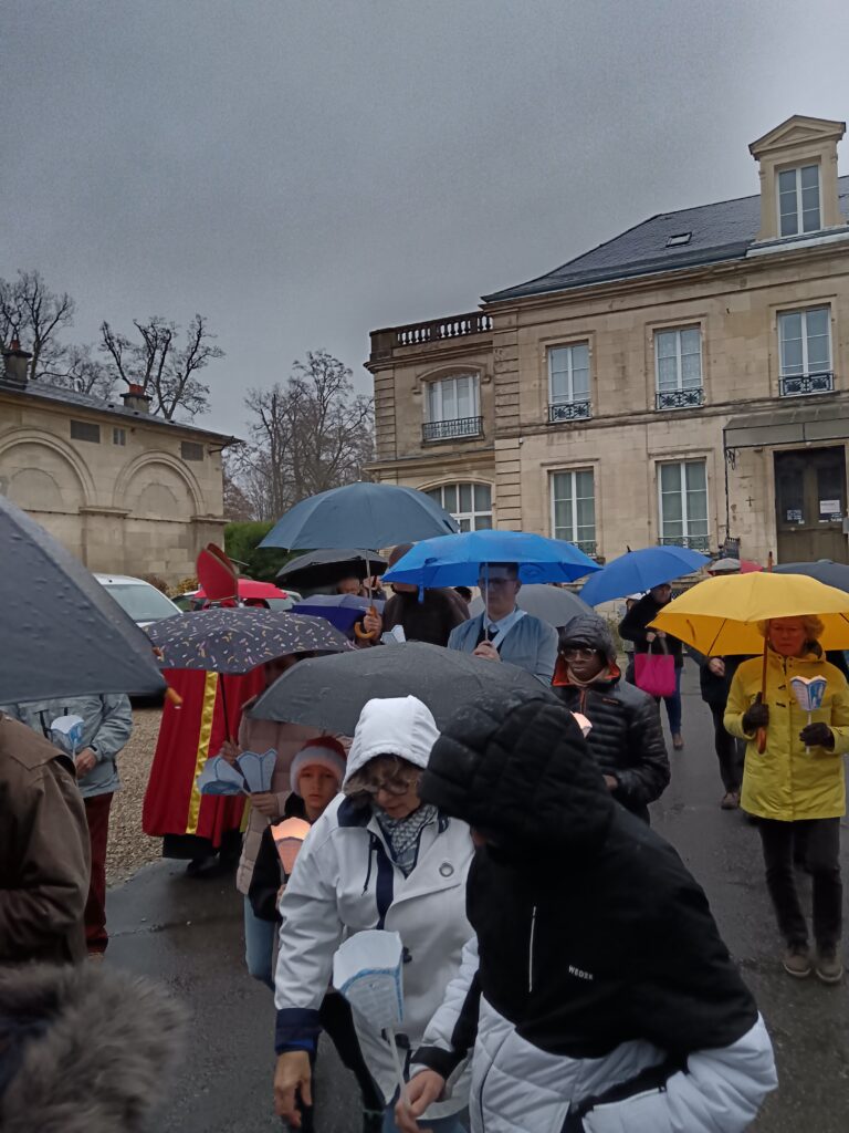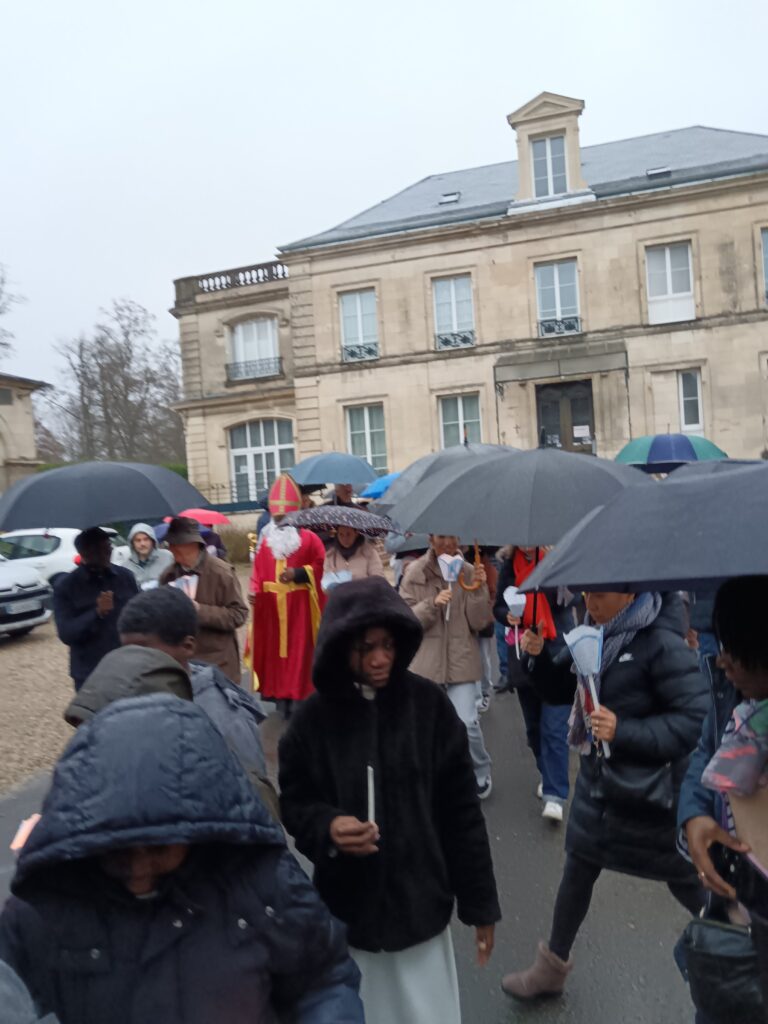 La procession sous la pluie… et sous la joie ! Les étapes prévues dans les rues ont dû être écourtées à cause des averses, mais cela n’a en rien entamé la bonne humeur des participants ! Parapluies, chants joyeux et sourires ont accompagné saint Nicolas jusqu’à l’église. Une vraie procession d’enfants de Dieu heureux d’être ensemble !