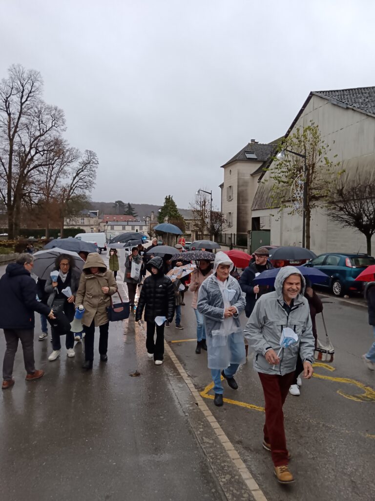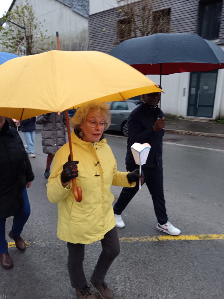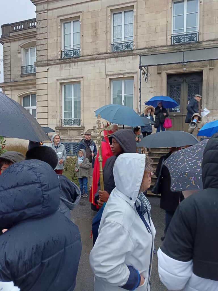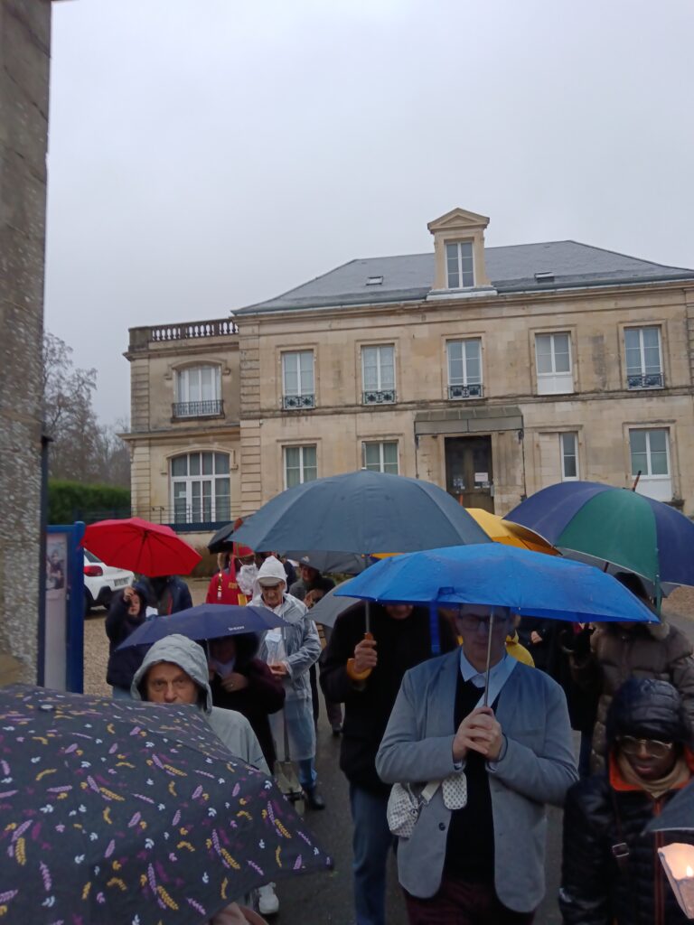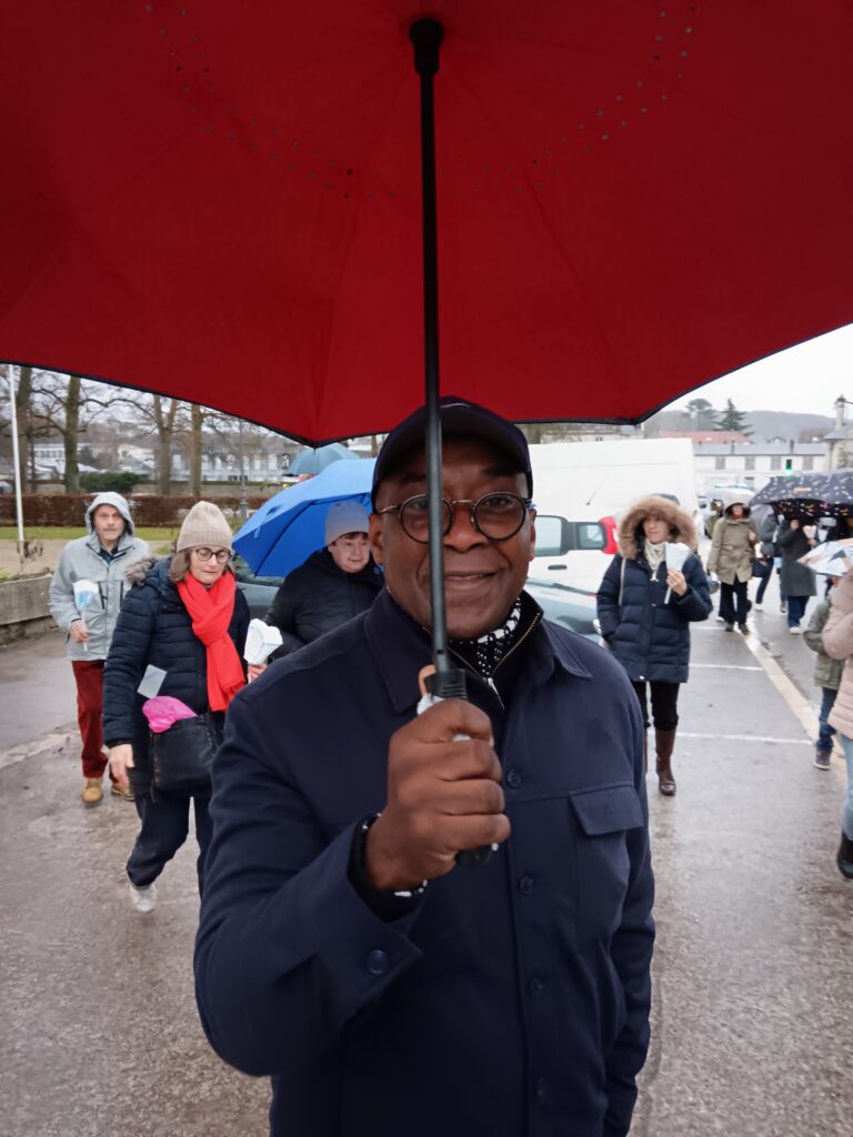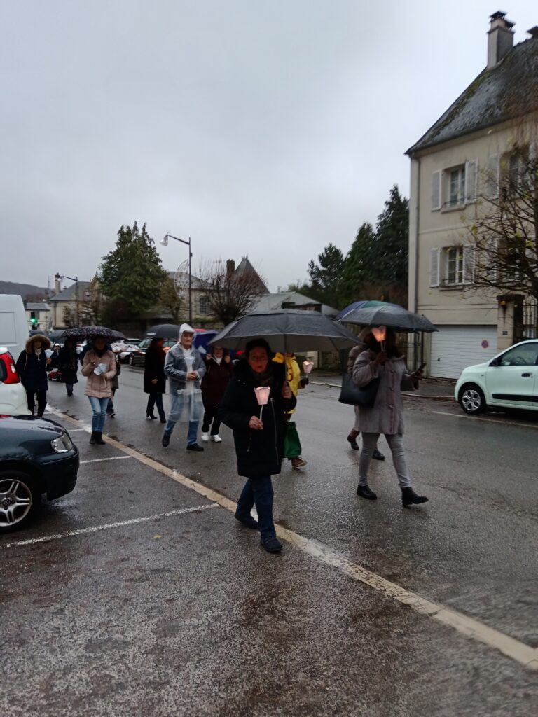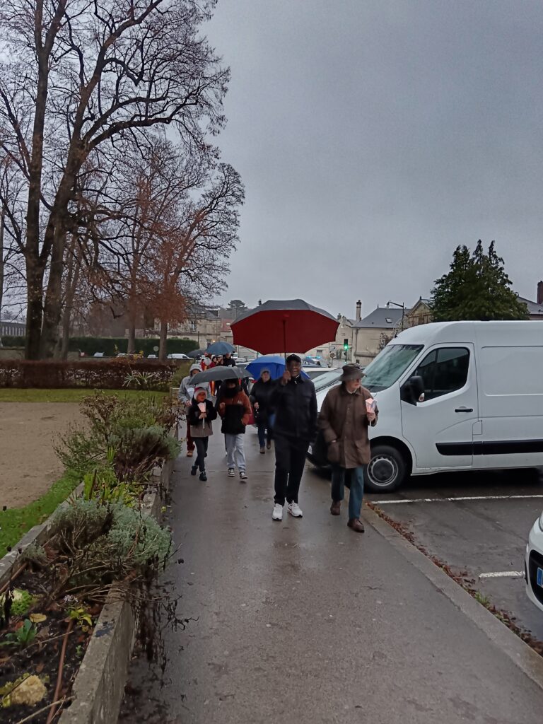 La procession sous la pluie… et sous la joie ! Les étapes prévues dans les rues ont dû être écourtées à cause des averses, mais cela n’a en rien entamé la bonne humeur des participants ! Parapluies, chants joyeux et sourires ont accompagné saint Nicolas jusqu’à l’église. Une vraie procession d’enfants de Dieu heureux d’être ensemble !