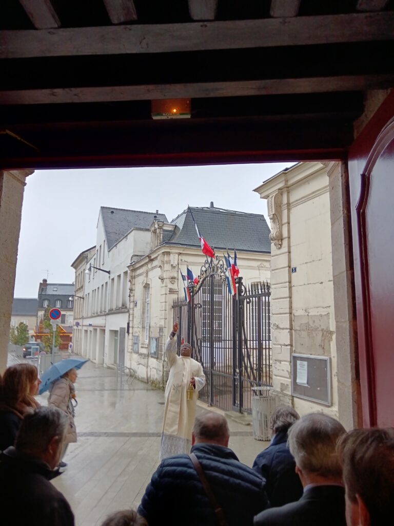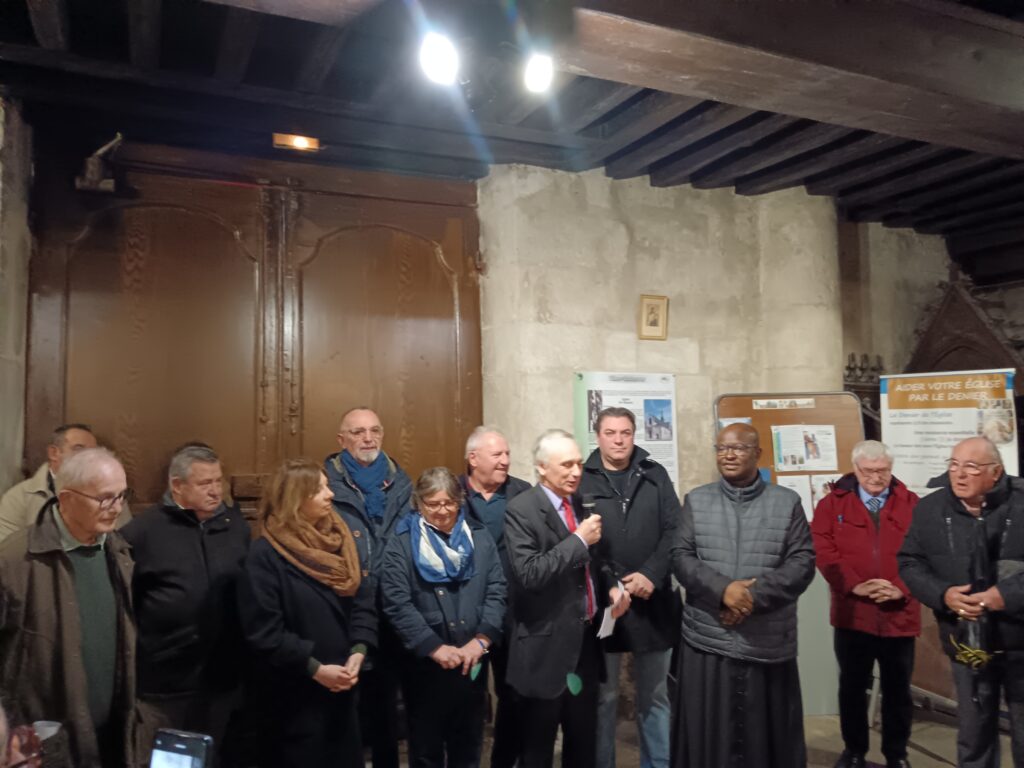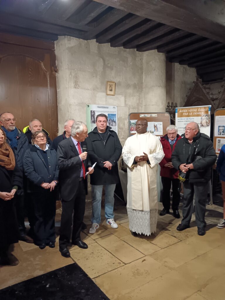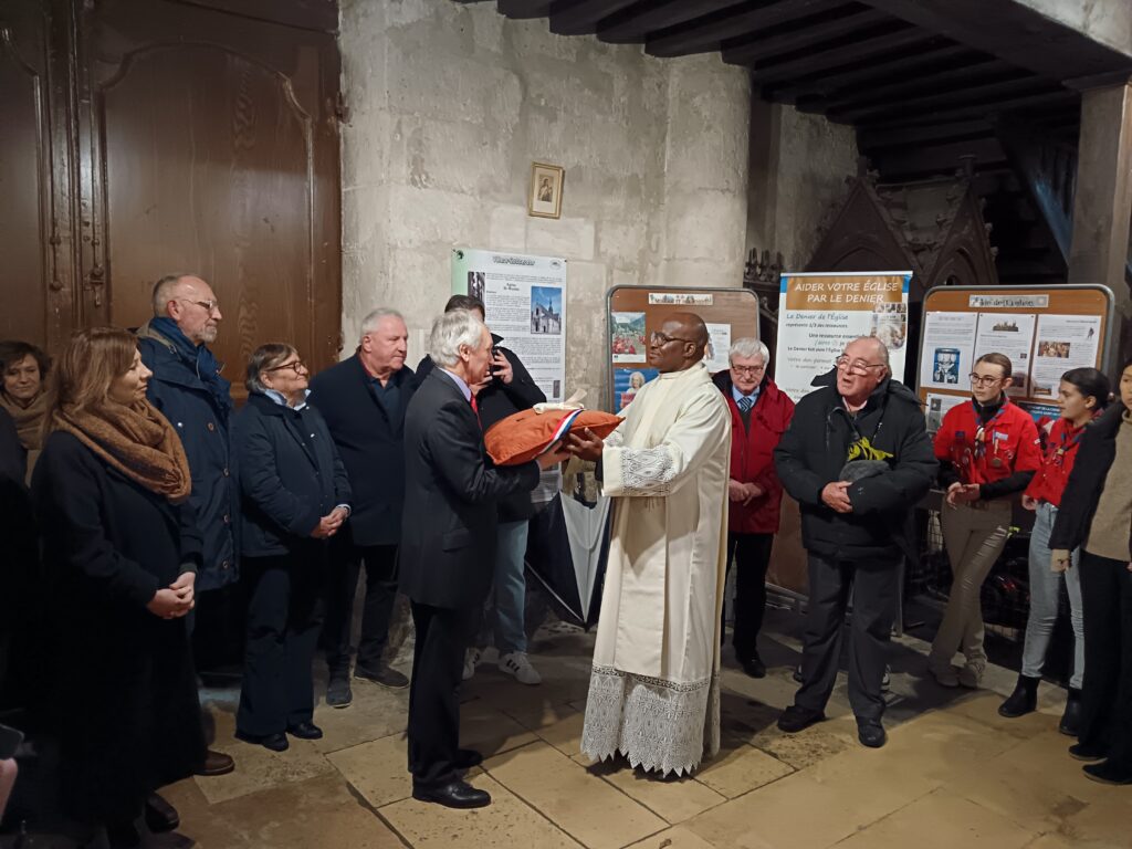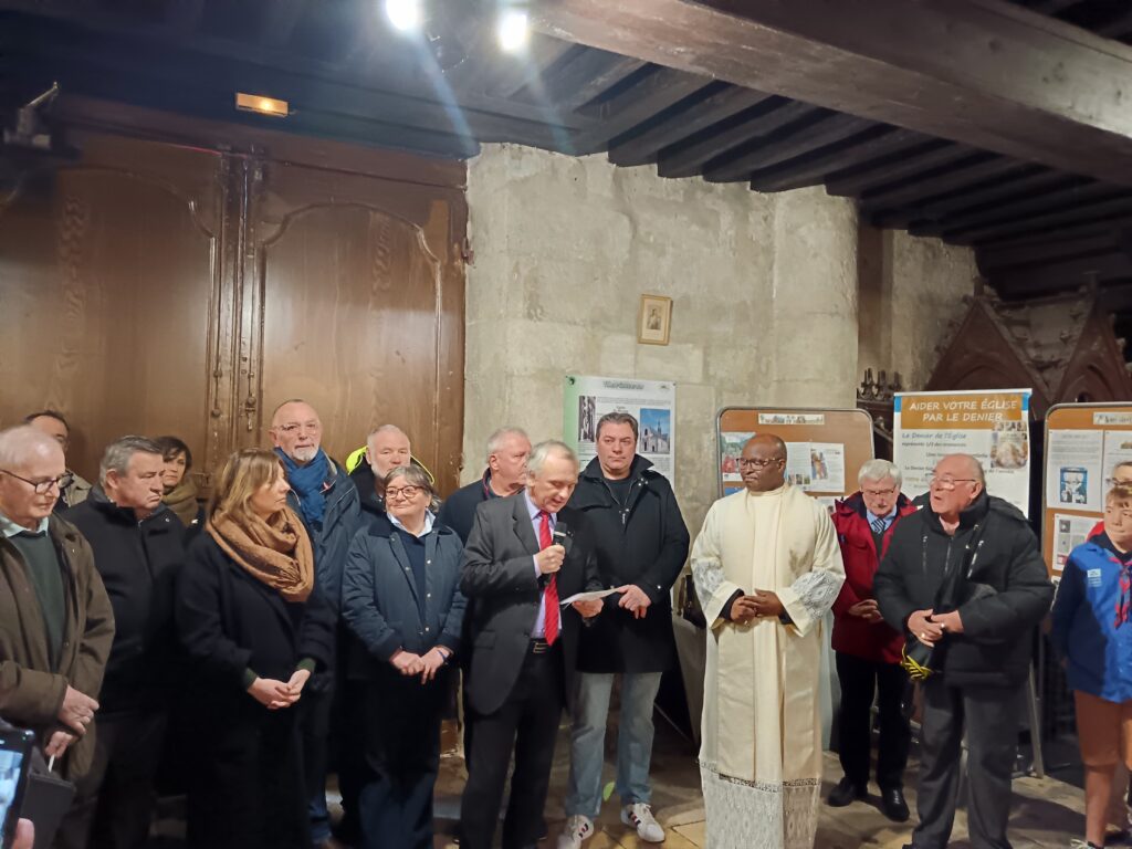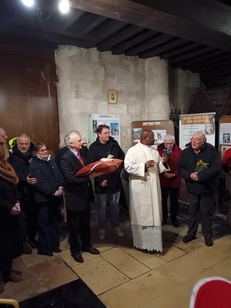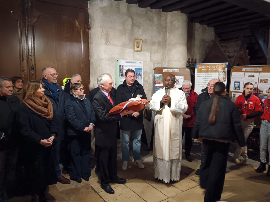 10 h 00 – Les autorités civiles nous rejoignent Monsieur le Maire, plusieurs conseillers municipaux, notre député et les représentants des artisans qui ont travaillé avec tant de cœur à la restauration de l’église étaient présents. Le maire a pris la parole pour saluer l’achèvement de ces longs travaux et la beauté retrouvée de notre « maison commune ».