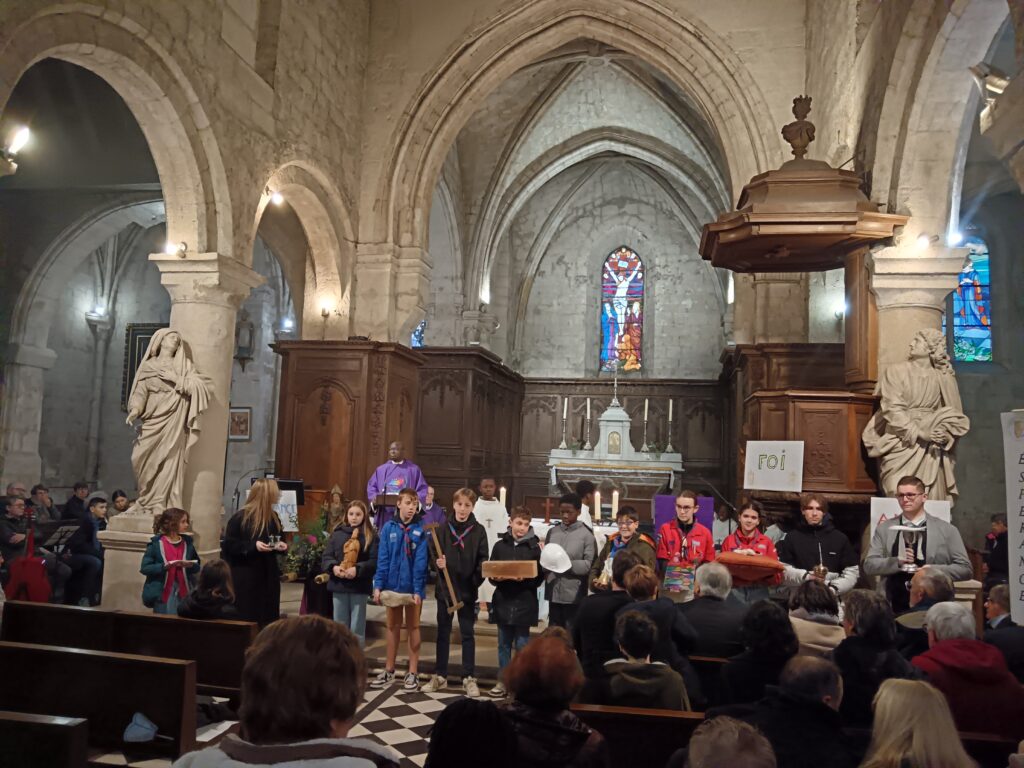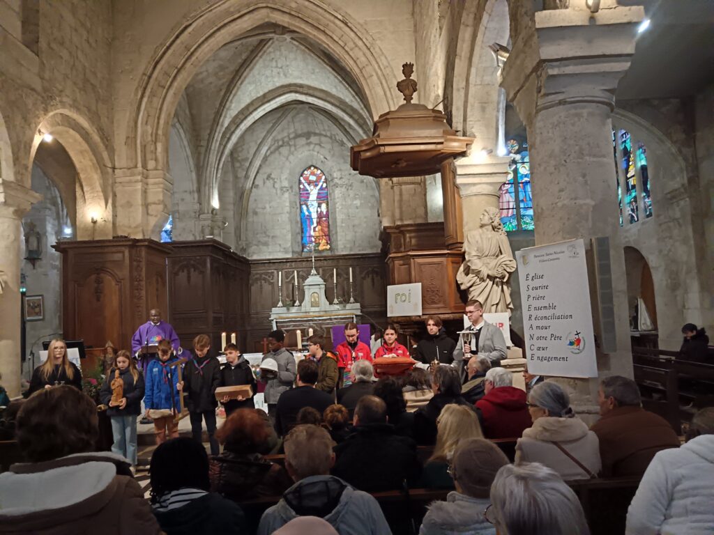10 h 30 – Messe solennelle La célébration, toujours présidée avec tant de cœur par le Père Aimé-Victor, a été un véritable action de grâce. À l’offertoire, les enfants ont porté à l’autel un objet symbolisant chaque corps de métier ayant participé à la restauration : casque de chantier, poutre, pierre… Un très beau geste pour dire merci à tous ceux qui ont rendu possible cette renaissance de notre église.